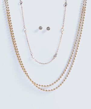 Set de collar + aretes para mujer, tono dorado, collar triple compuesto por eslabones medianos y cuencas, aretes circulares con brillos, úsalo para elevar tus outfits casuales. Hechos en metal con un baño de oro. ¡Start Shopping!